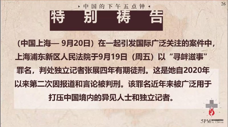 中国的下午五点钟,为狱中肢体代祷