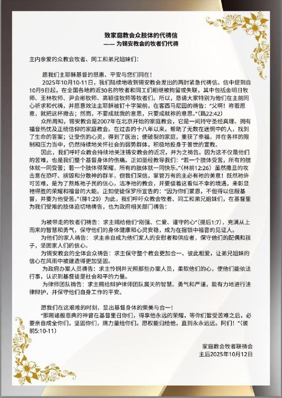 https://substack.com/home/post/p-175957344 A Prayer Letter From Detained Zion Church Pastor Wang Cong‘s Husband |锡安教会北京王聪牧师丈夫发出的代祷信