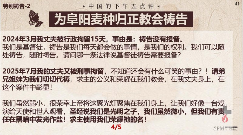 我是阜阳麦种圣约归正教会马涛长老的妻子李梅,我丈夫马涛于2025年6月29号因涉嫌“组织非法聚集罪”被羁押。