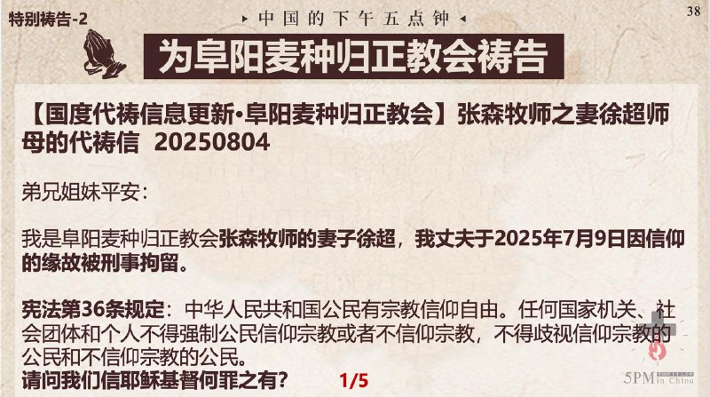 我是阜阳麦种归正教会张森牧师的妻子徐超,我丈夫于2025年7月9日因信仰的缘故被刑事拘留。