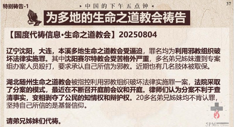 辽宁沈阳,大连,本溪多地生命之道教会受逼迫,罪名均为利用邪教组织破坏法律实施罪。其中沈阳赛尔特教会受苦格外严重,多名弟兄姊妹遭到专案组办案人员殴打,要求承认自己所信为邪教。近期也有几名肢体被取保。