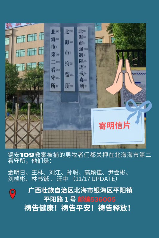 1,以下牧者同工已经转往监狱服刑,未来如果得到准确地址,再分享给大家,请大家寄明信片: